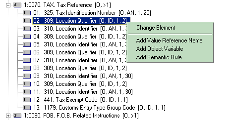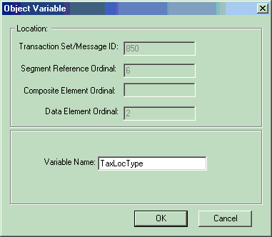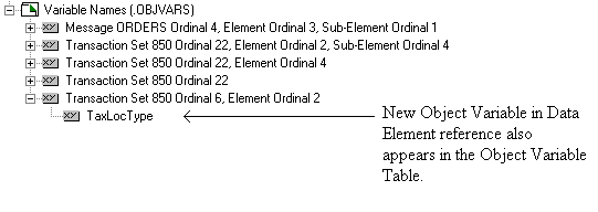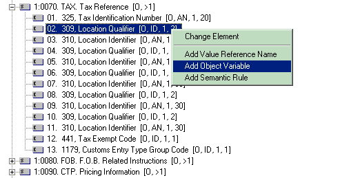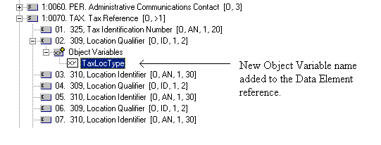The following steps demonstrates how to add an Object Variable to a Data Element reference. For example, the Object Variable with the name "TaxLocType" will be added to the Data Element reference 309 (Tax Identification Number) having ordinal number 2, which is contained in Data Segment TAX (Tax Reference). The segment reference TAX has an ordinal number 6 in the ASC/X12 Transaction Set 850.